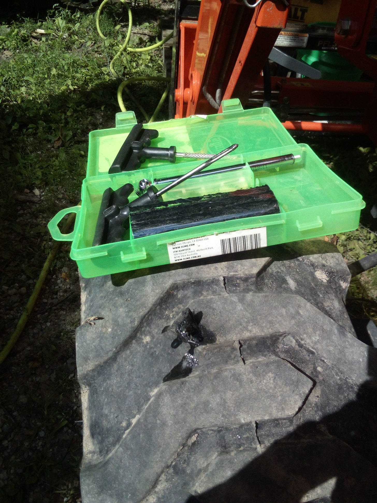 Today I skidded some logs to the milling location, using the Kubota; while accomplishing this task I had to put three plugs in the front left tire (see picture at the top), and at the end it is flat again. I’ll take the wheel and tire in Monday for repair or replacement.