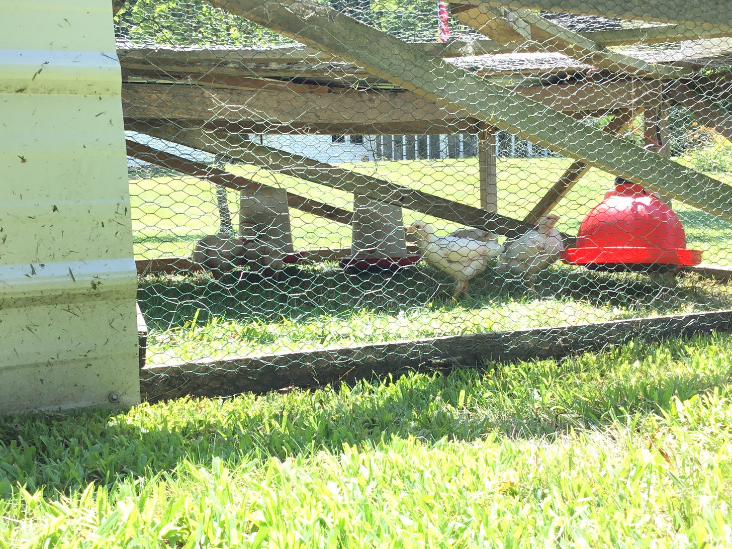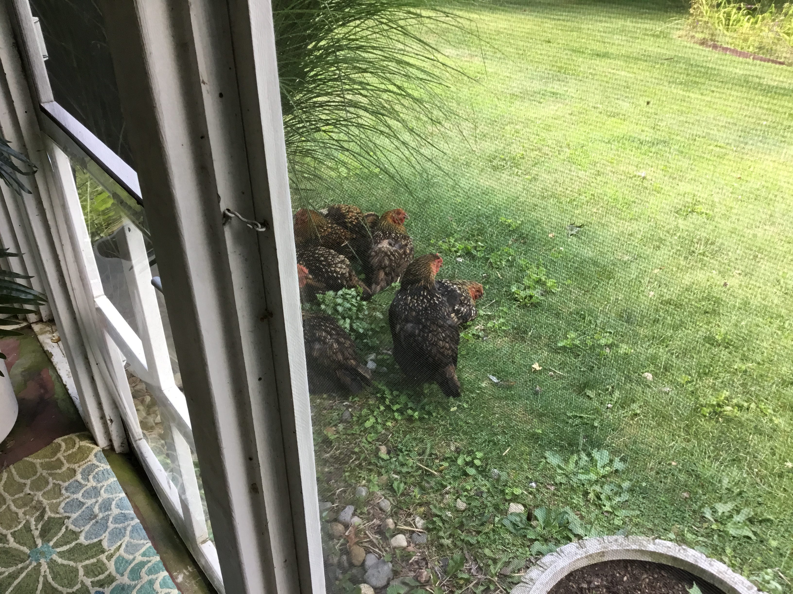 And the Layers are hanging out in a usual spot for them, under small patch of shade thrown by some tall decorative grass just outside the screened-in porch.