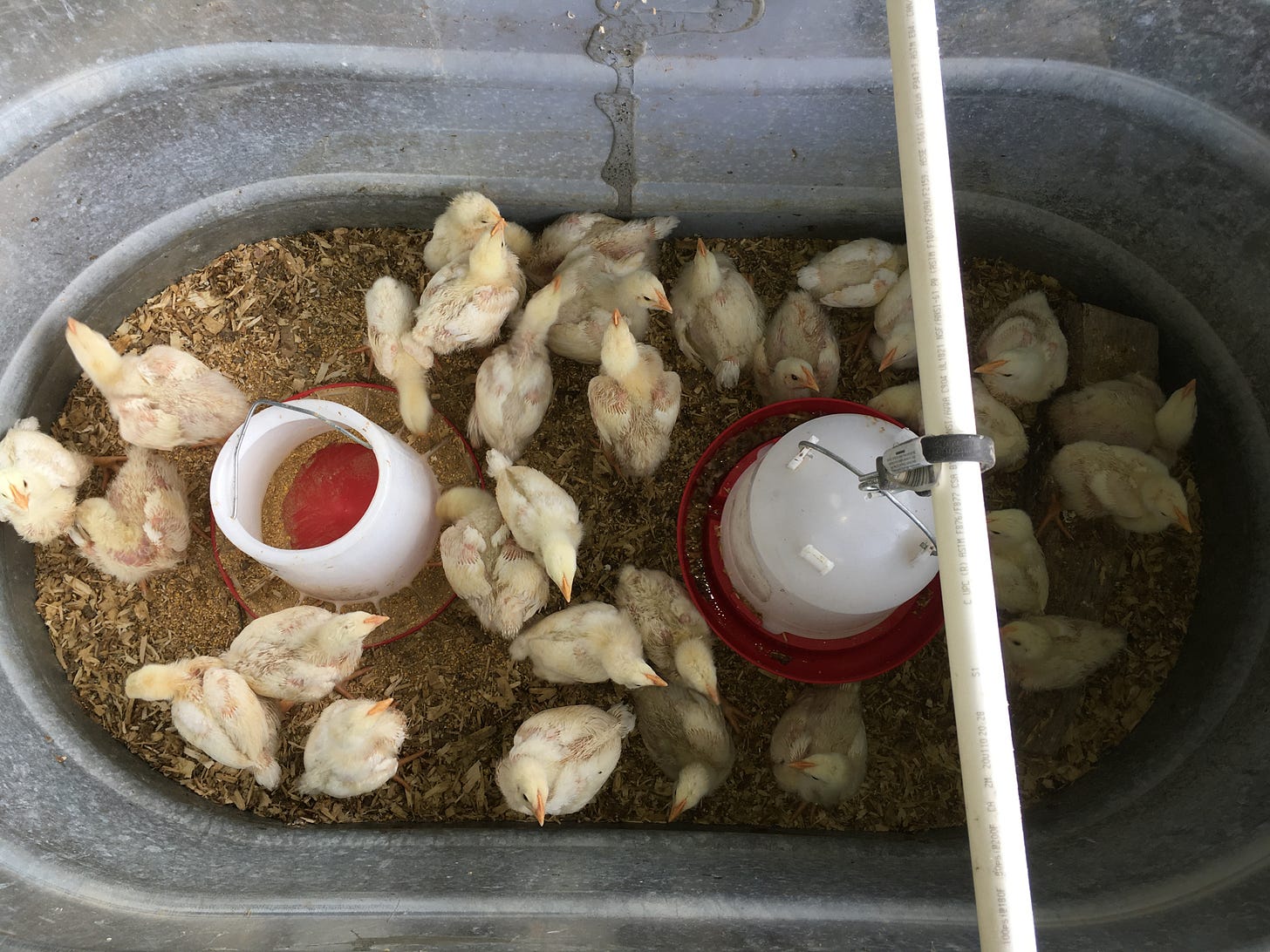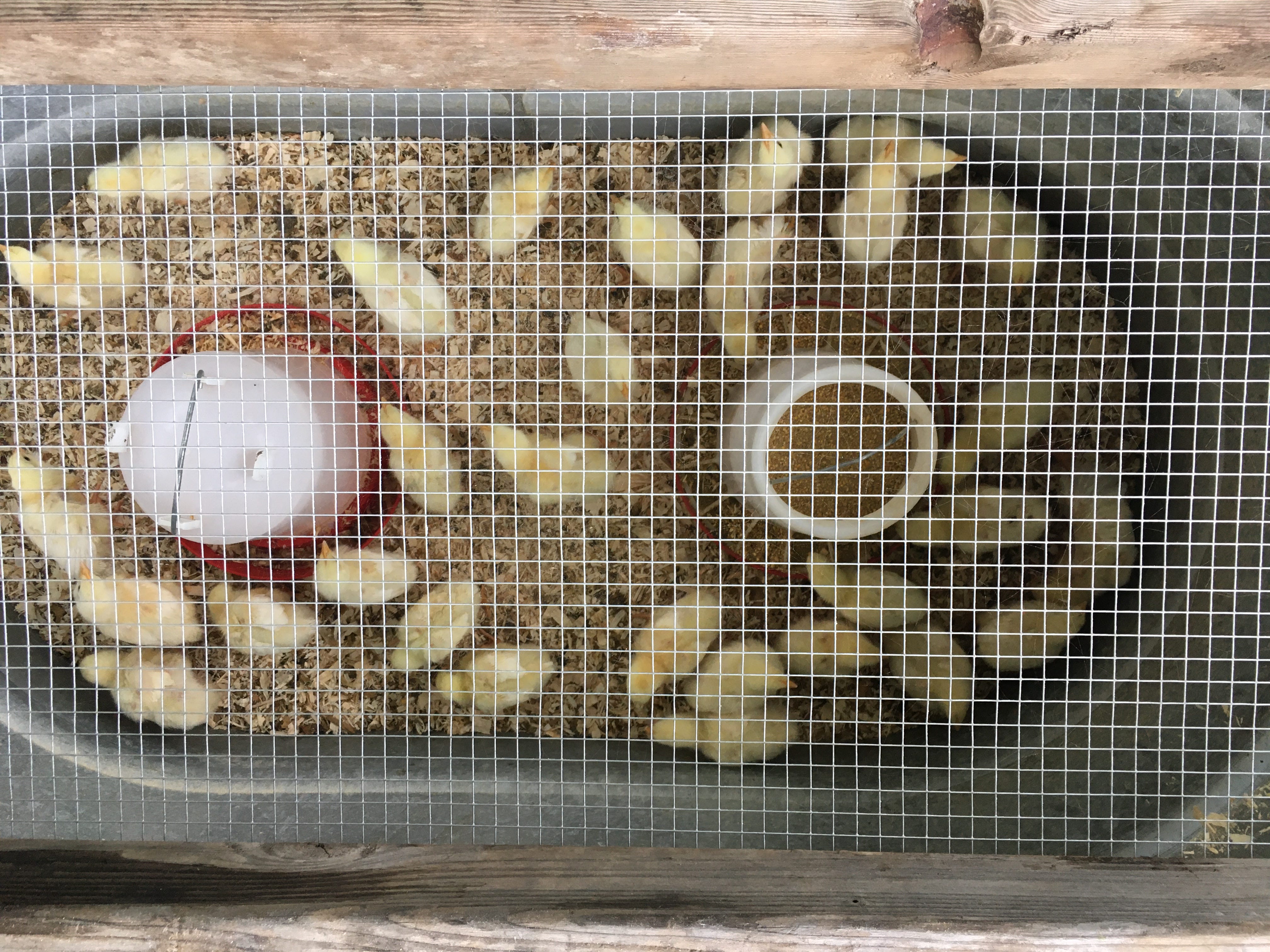 The Meat Birds after ywo weeks and a day … significant growth since a week ago; these birds will go into the “chicken tractor” soon.
