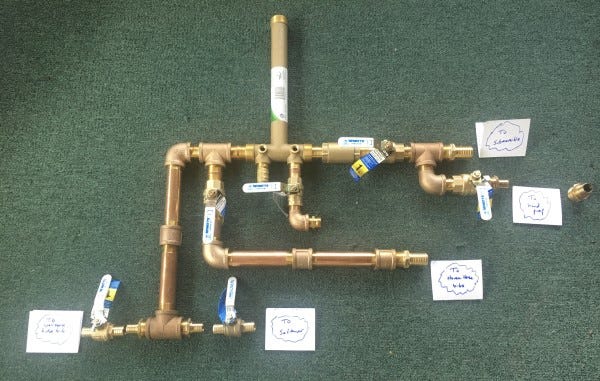 The decision to use brass for the manifold having been made, it was simply a matter of organizing and assembling the necessary components, and then connecting the manifold to the Poly and 1″ PEX lines.